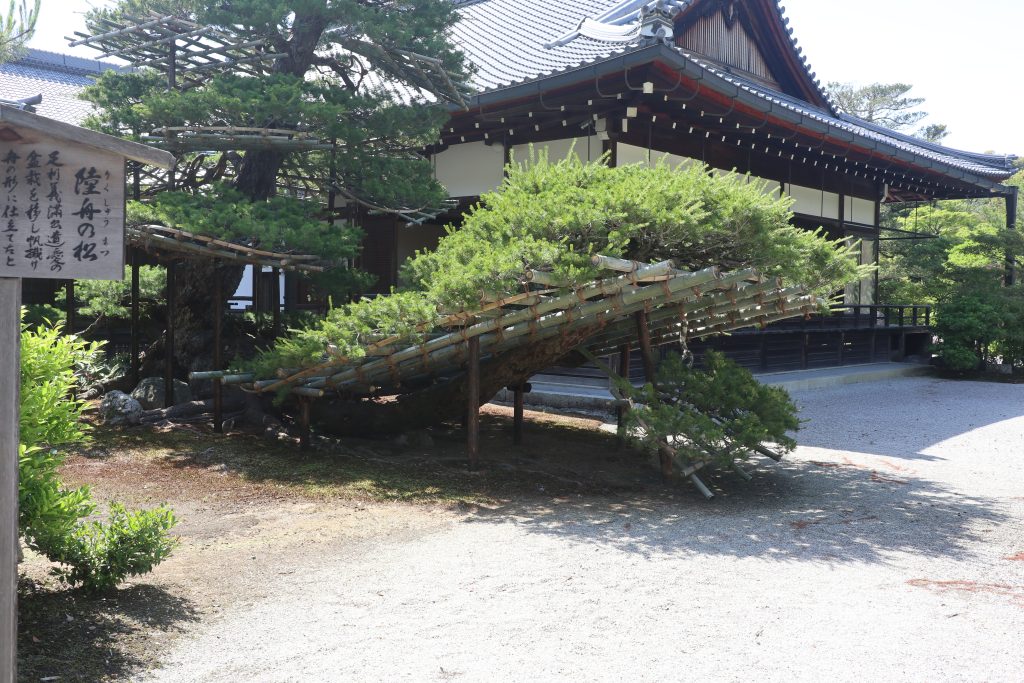 陸舟の松(りくしゅうのまつ)は、室町時代前期に足利義満が植えた盆栽を帆掛け舟(ほかけぶね)に仕立てたものと言われていて、舟先が西に向けられていることから、浄土思想を表しているとも言われています。また、陸舟の松は樹齢約600年とも言われる五葉松(ごようまつ)で出来ていて、‘‘おかぶねの松‘‘とも言われています。
