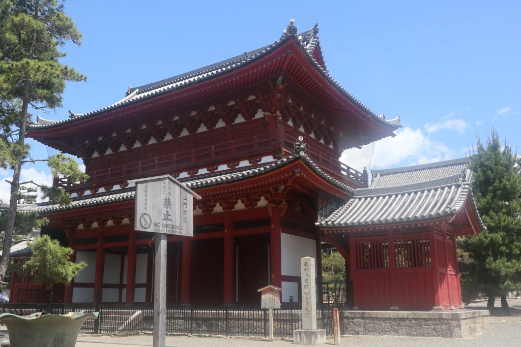 三門は、慶長4(1599)年に創建されたもので、重要文化財に指定されています。楼上(ろうじょう)には、観世音菩薩(かんぜおんぼさつ)と十六羅漢(じゅうろくらかん)が祀られ、色鮮やかに飛天や鳳凰、龍の図が柱や梁に描かれています。